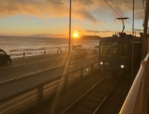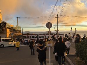 駅から江ノ電が出て、後ろに夕日&江ノ島が最高。